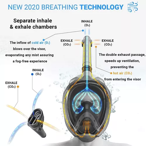 Respira por la nariz mientras buceas. Adiós molestias en la mandíbula (no hay boquilla incómoda para morder). Adiós respiración difícil y adiós agua en su snorkel gracias a nuestro snorkel seco. Para bien Gran campo de visión y no más nebulización gracias a nuestra tecnología de circulación de aire patentada y probada de forma independiente.